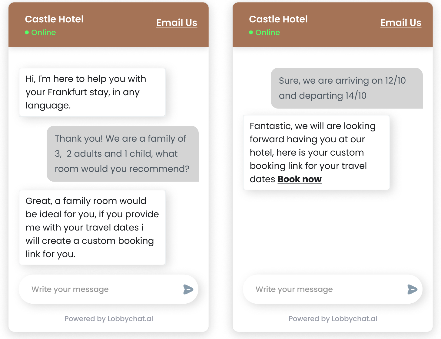Lobbychat.ai starts at just USD 499 per year with unlimited chats included in any language, so you never have to worry about overage fees or hidden costs. And if the chatbot can’t answer a question, it automatically gives guests the option to email your hotel directly, so no inquiry is ever left unresolved.