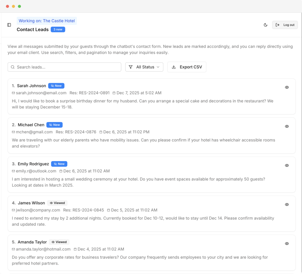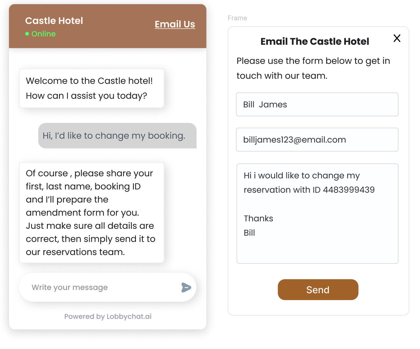 Guests can email your hotel directly from the chat. This ensures no question is left unresolved and lets your team follow up personally.