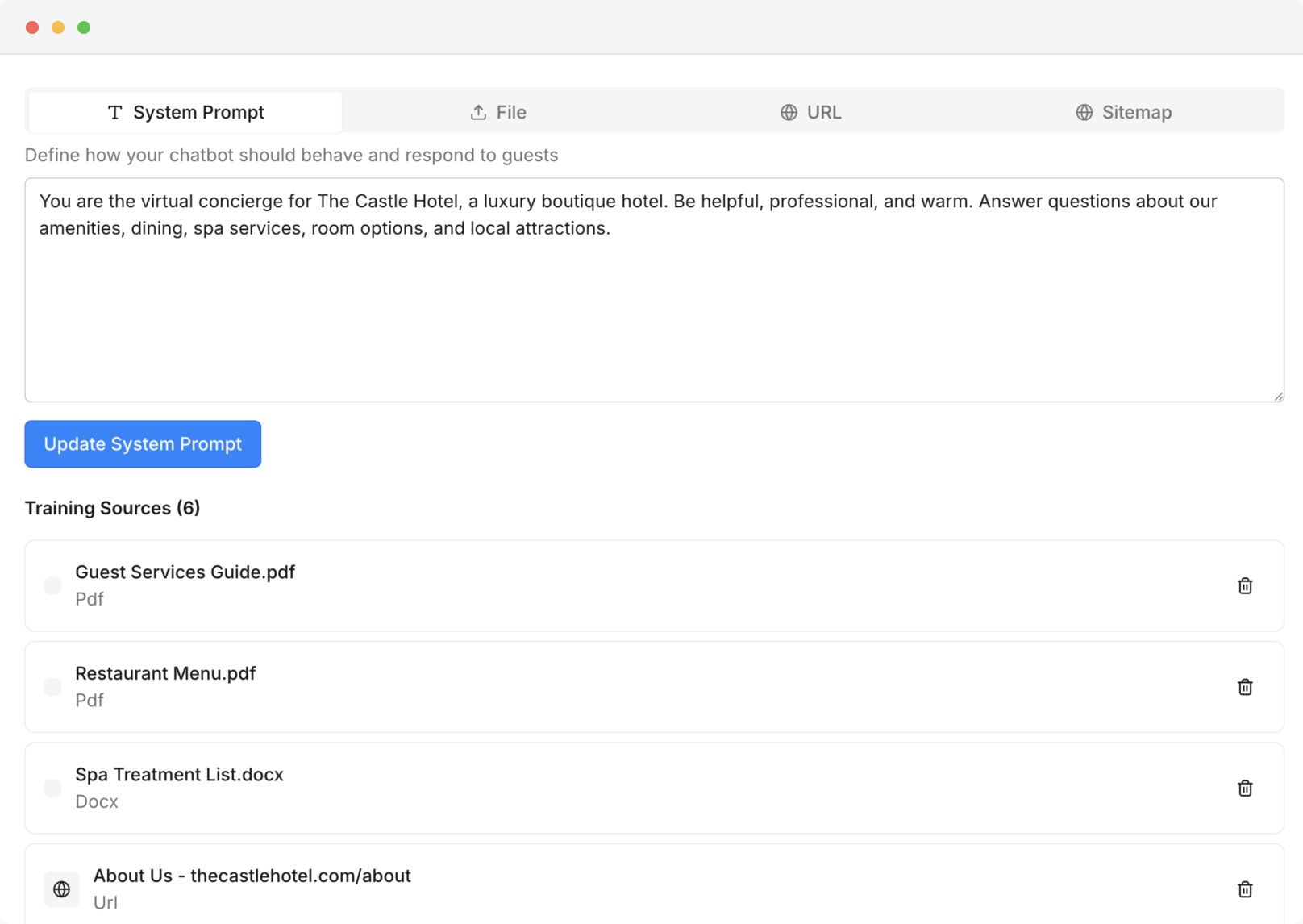 Lobbychat.ai trains itself by reading your website content, prompts, and uploaded files, just like a real team member would but in seconds. It continuously improves using guest questions and your feedback, so answers get sharper over time without extra work from your staff.
